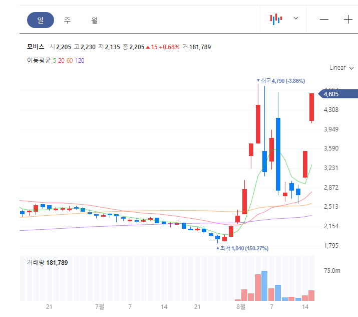120일선을 돌파한 8월 1일이나 8월 2일에 매수 기회가 있었는데, 단기적인 급상승으로 인한 리스크를 고려해서 매수를 망설였을 것이다.