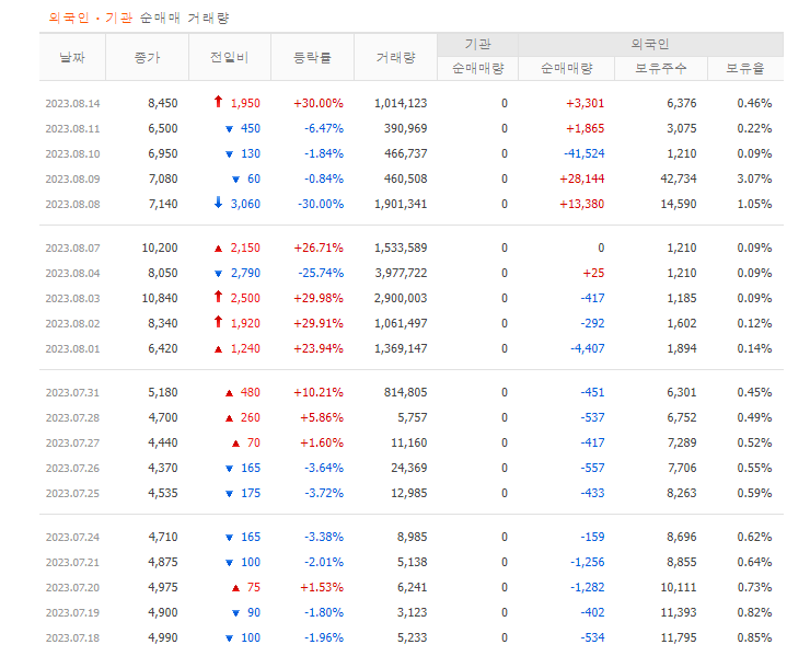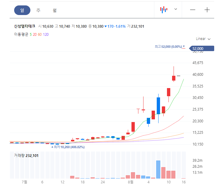 초반에는 서남이 초전도체 대장주라고 생각했었는데, 지금은 확실히 신성델타테크가 대장주다.