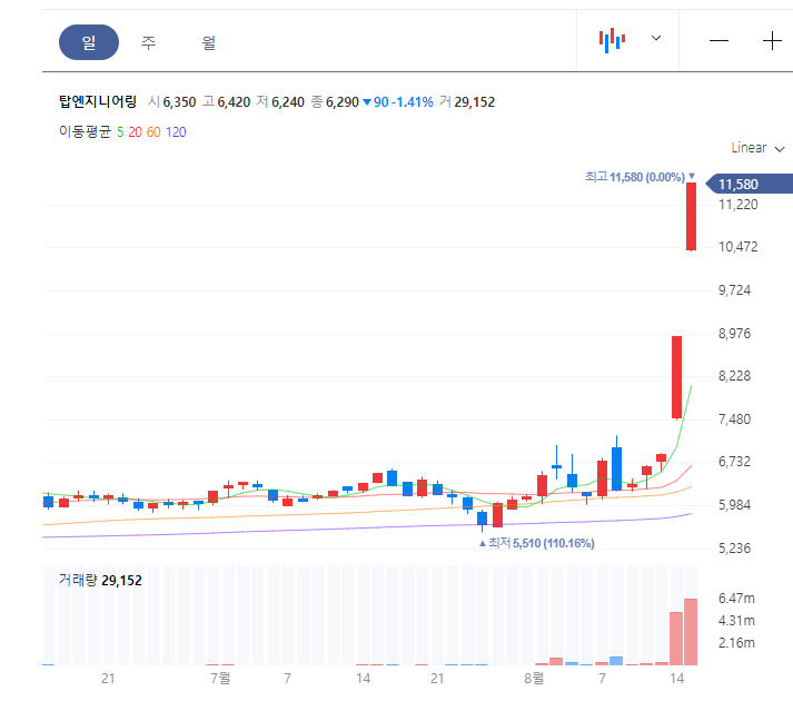 초전도체 관련주인 파워로직스의 최대 주주가 뒤늦게 탑엔지니어링이라고 알려지면서 8월 14일 월요일부터 상한가를 갔다. 초전도체가 워낙 강하기때문에 초전도체 관련주를 조사하면서 최대주주까지 확인했다면 이 종목을 매수할 수 있었을 것이다.