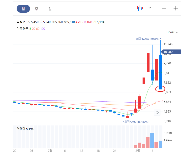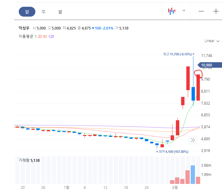 8월 3일 상한가 따라잡기로 보통주인 덕성이 상한가를 갔기에 우선주인 덕성우를 상한가 가기 바로 전에 소액을 매수 했다.