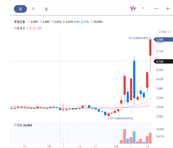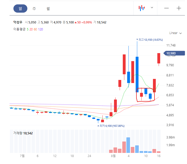 처음으로 거래량이 터졌고 17.71% 상승한 7월 31일의 차트다. 이동평균선이 역배열 상황이고, 종가도 60일선에서 머물러 있고, 120일선은 돌파도 못했는데, 이 지점에서 매수를 할 수 있었을까? 아마도 못했을 것이다.